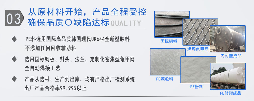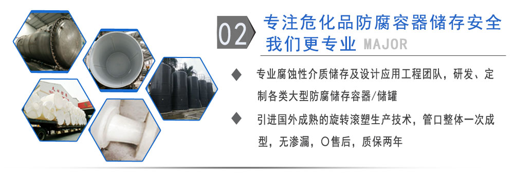 公司有鋼襯塑PE/PO、PE全塑、碳鋼、不銹鋼四大系列100多個品種,專注于常壓儲存容器生產(chǎn),其產(chǎn)品包括鋼襯塑儲罐管口一體成型PE儲罐碳鋼儲罐不銹鋼儲罐、反應(yīng)釜、攪拌罐、離子交換柱、鋼襯PE/PO儲罐塑料儲罐鹽酸儲罐硫酸儲罐等等。更大限度滿足廣大客戶的各種需求,同時可以根據(jù)客戶的需要加工定制各種防腐設(shè)備。